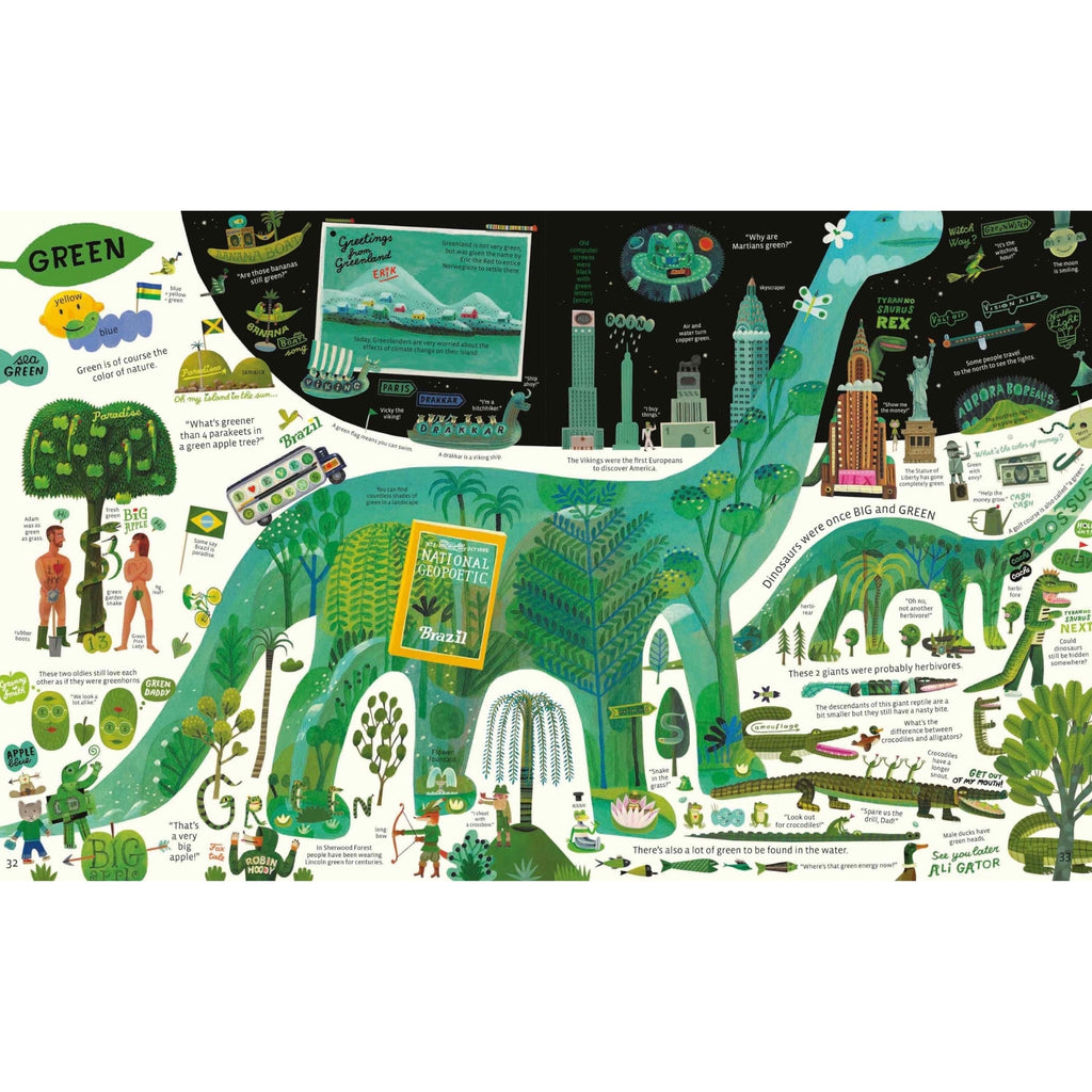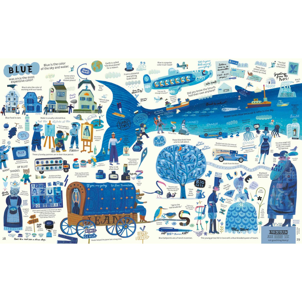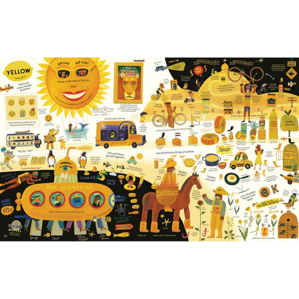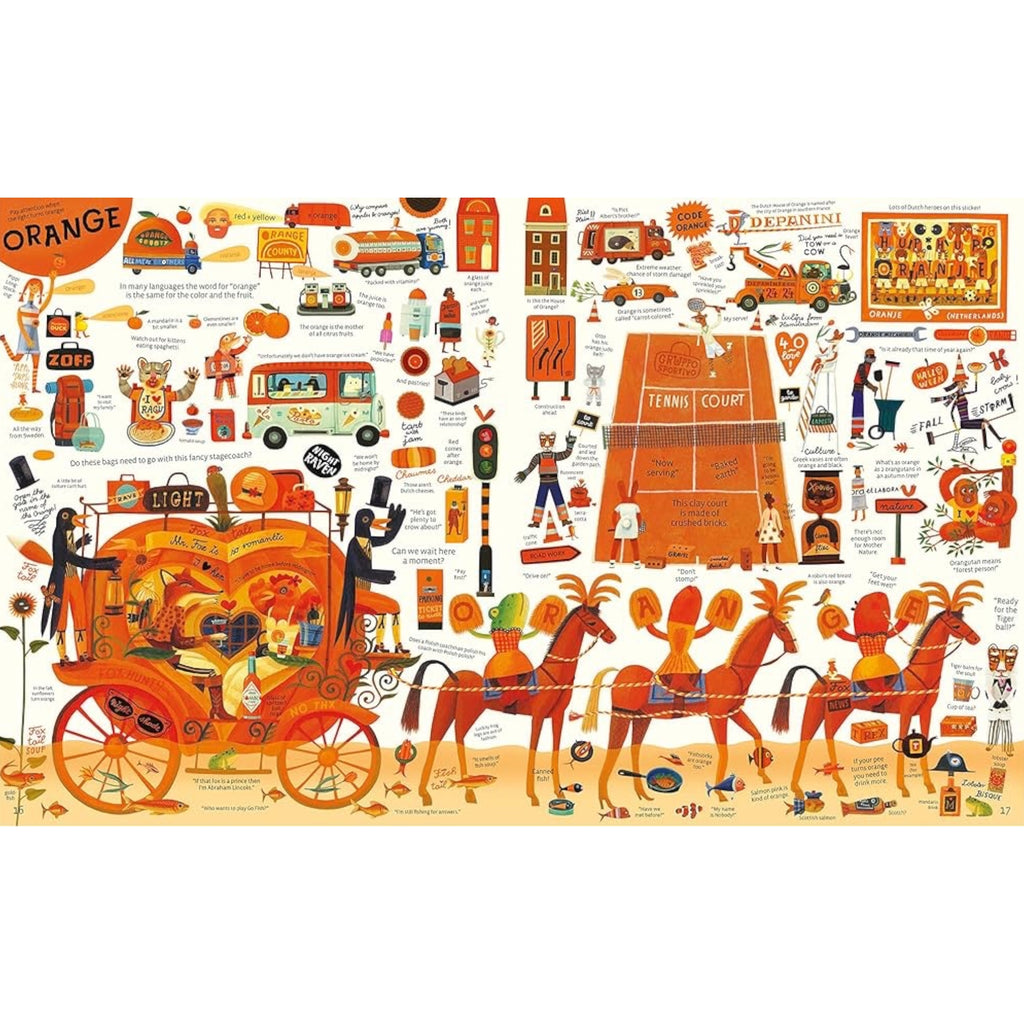 One winter morning, Otto the cat looks out the window and sighs, “Why is everything so gray today?” Luckily his friend Leon the chameleon is around to show him just how many colors there are in the world. In these exciting and funny spreads filled to the brim with brilliantly illustrated objects, Leon and Otto identify people, places, and things of every hue. On pages dedicated to infinite shades of a single color, Tom Schamp’s brilliant drawings play with perspective and unexpected pairings. An enormous Bengal tiger lords over an orange-tinted world, while a giant blue whale dwarfs elephants, pairs of jeans, and police officers. Throughout, cleverly inserted puns and allusions will elicit plenty of laughs from parents and children alike. Parents will enjoy the numerous ways color is depicted and kids will spend hours looking for their friends Otto and Leon as they traverse the busy pages. Best of all, this delightful adventure comes to a perfect end when all the colors come together in one beautiful, joyful rainbow of fun.