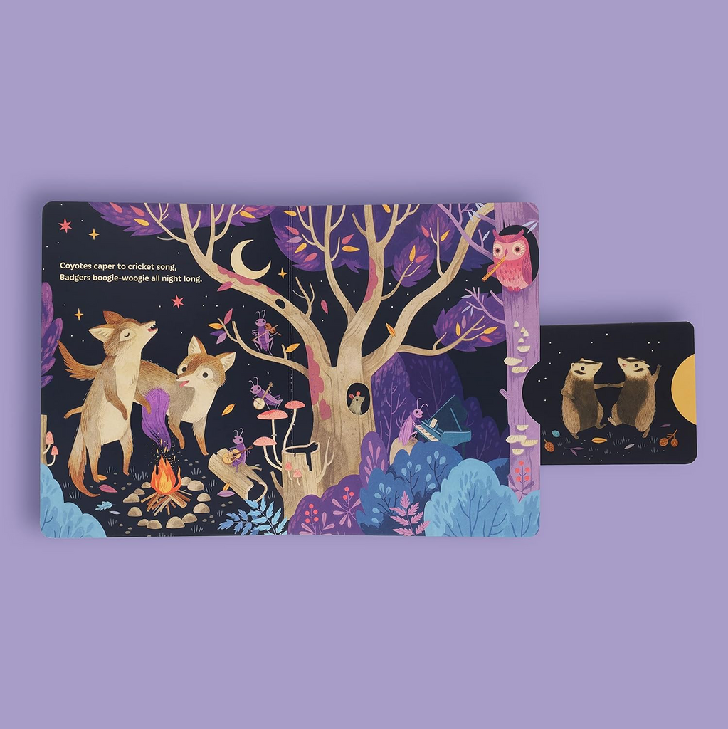When you rest your head at night, nocturnal animals awake to dance and play! Push and pull the sturdy tabs to make foxes frolic and hedgehogs hustle in this sweet, interactive tale of nighttime fun.