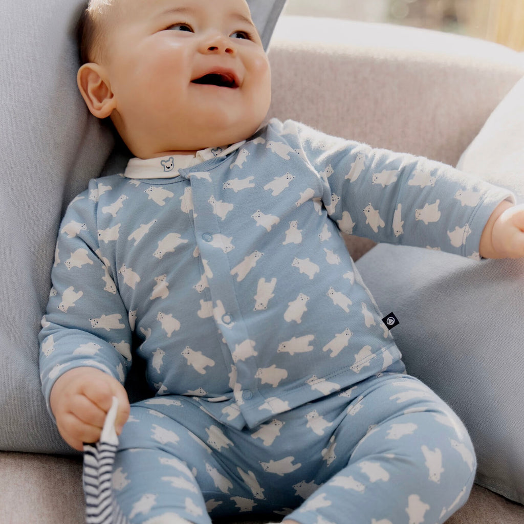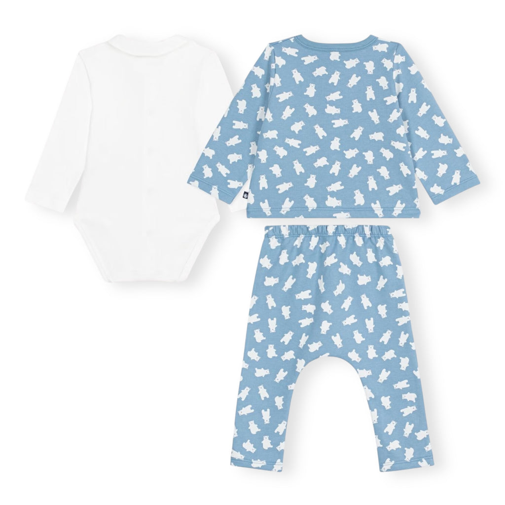 Petit Bateau Bear Print Cardigan, Pants & Collared Onesie Set ~ Blue/White