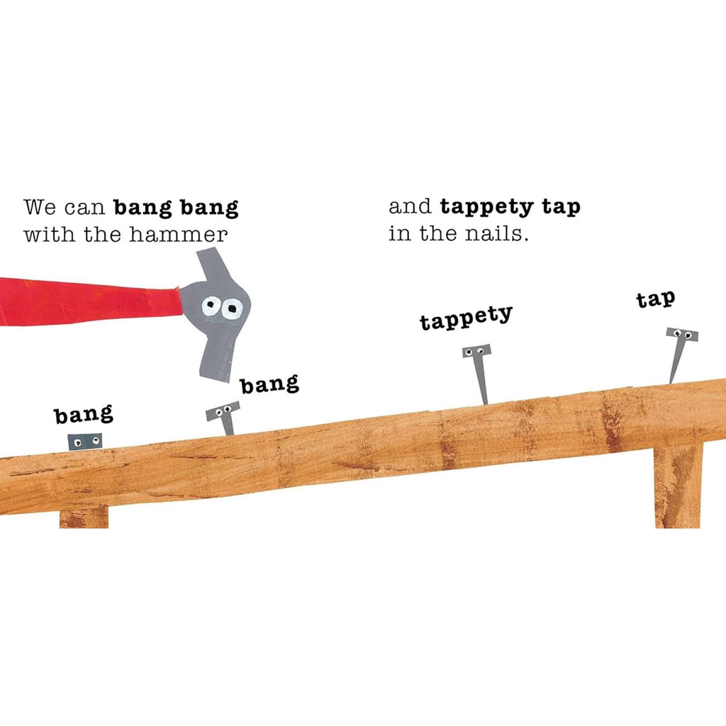 Cree craw with the saw, bang bang with the hammer, and twizzle, twist, twirl, and spin with the screwdriver, bolts, and nuts. What fun! Its tool time for children as they delight in colorful chisels, clamps, drills, pliers, and mallets at work. What could they be making? Kids will love finding out—and creating sound effects to go with this action-packed board book. Perfect for little builders!