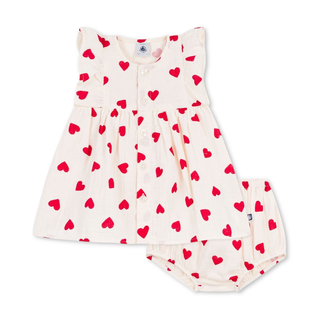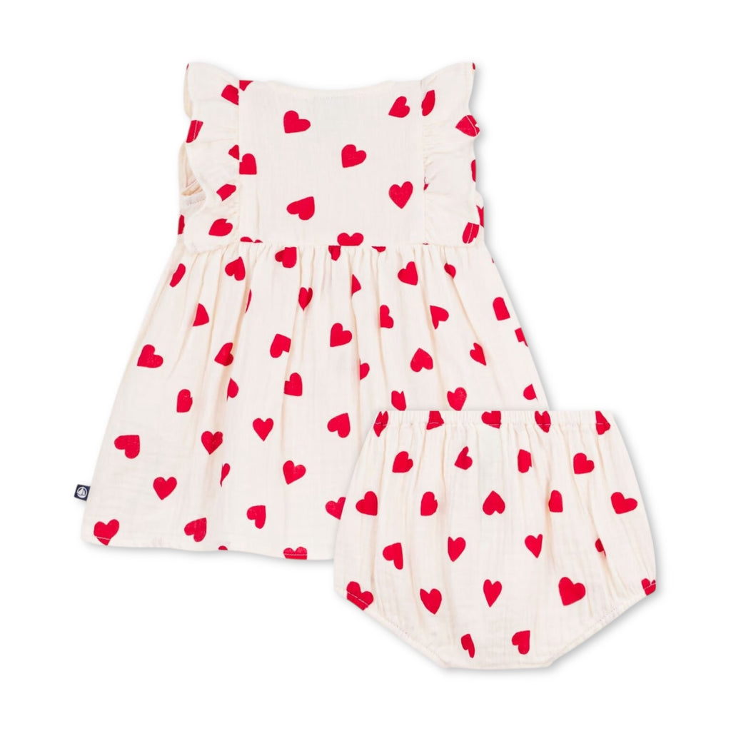 Petit Bateau Sleeveless Gauze Heart Print Dress w/ Bloomer~ Ecru/Red