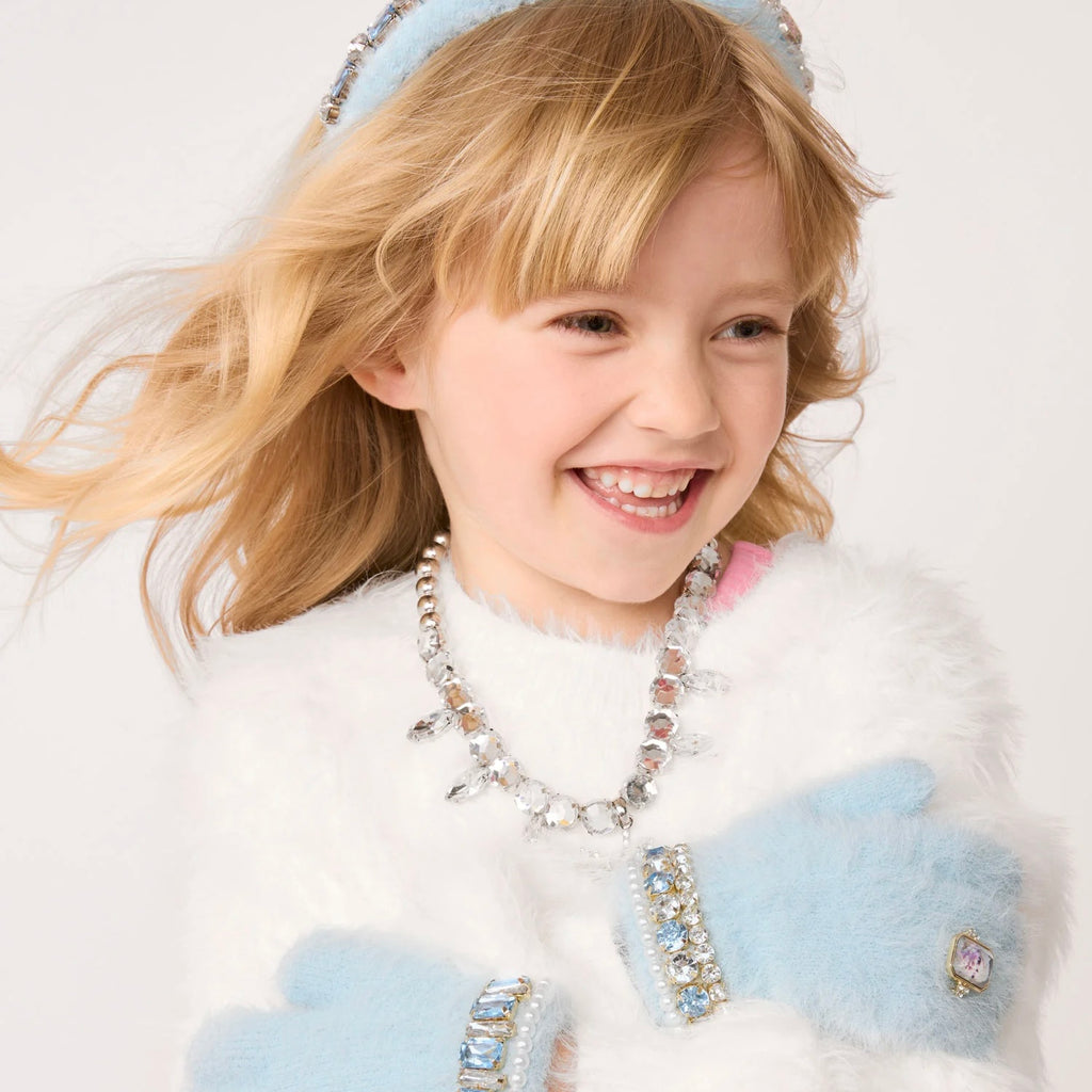 Keep the cold out and the style in with the Disney Frozen Elsa Winter Jeweled Gloves! These blue gloves are fluffy, cozy, and perfect for winter.  Each glove is adorned with sparkling gems and pearls, adding a touch of royal flair. And the best part? A dazzling snowflake ring on one hand and a gem featuring Disney Elsa's cameo on the other—because even in the frostiest weather, your little one deserves to sparkle!