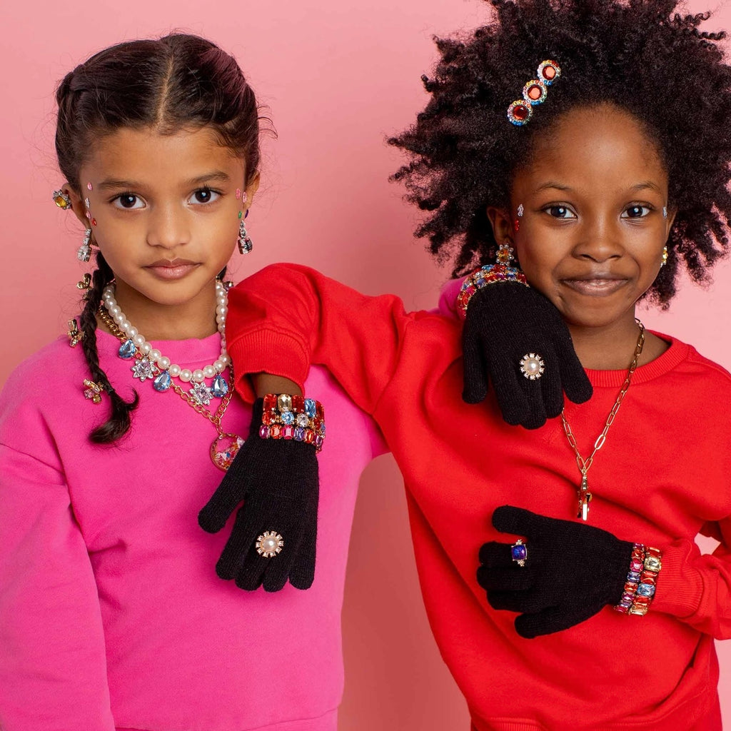 Brrr, time to keep those precious little hands covered! The coziest member of the Super Smalls crew is perfect for everything from ice skating outings, to walks to school, and sipping hot cocoa with pals. Embellished with colorful gemstones, now you can keep your fingers warm and your jewelry popping! Welcome to a winter sparkle-land.