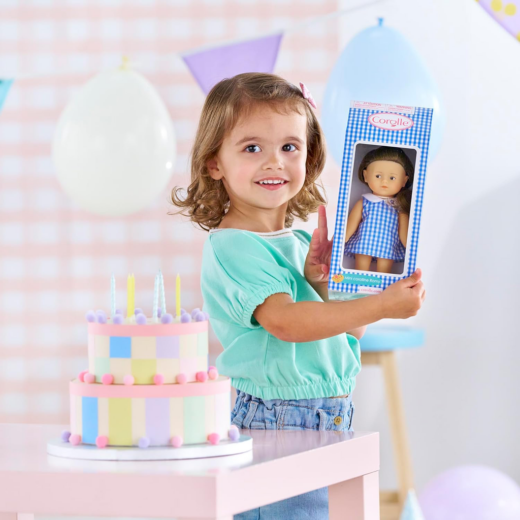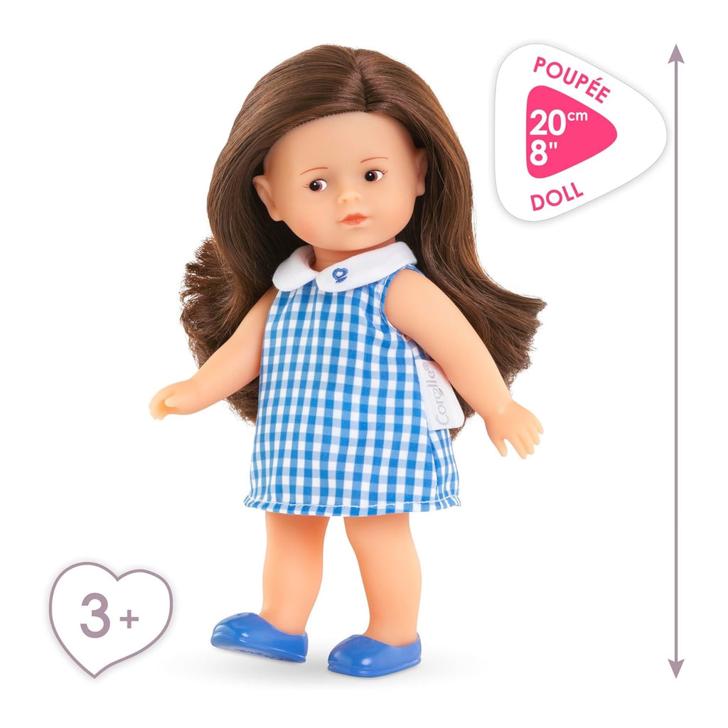Mini Corolline Romy is a petite doll ready to offer for any gift-giving occasion, with an all-vinyl body that is delicately scented with vanilla, a Corolle signature. Rosy has brown painted eyes and silky brown hair. She's dressed in a pink-and-white gingham dress with a Peter Pan collar over underpants...