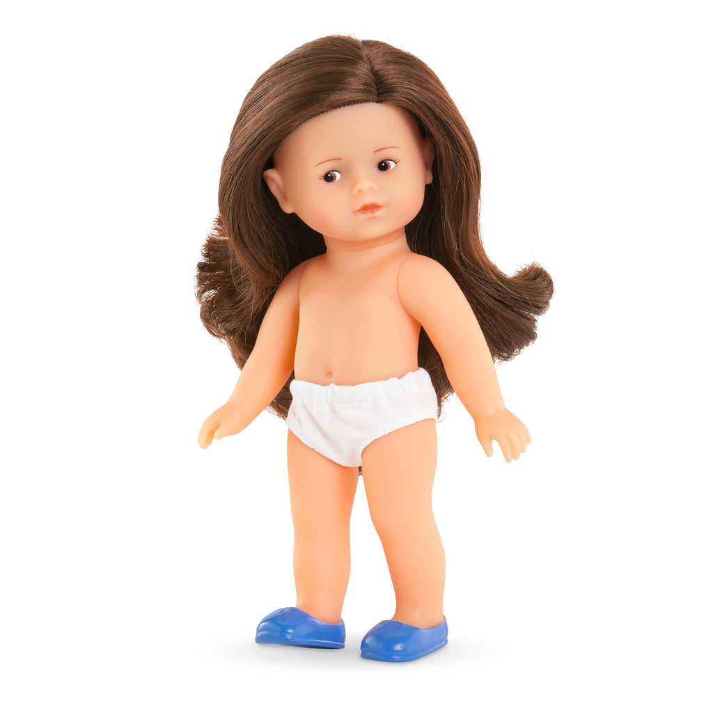 Mini Corolline Romy is a petite doll ready to offer for any gift-giving occasion, with an all-vinyl body that is delicately scented with vanilla, a Corolle signature. Rosy has brown painted eyes and silky brown hair. She's dressed in a pink-and-white gingham dress with a Peter Pan collar over underpants and matching molded shoes (not removable). At just 8 inches tall, Romy is the ideal size to slip into a bag or backpack and accompany your child all day long.
