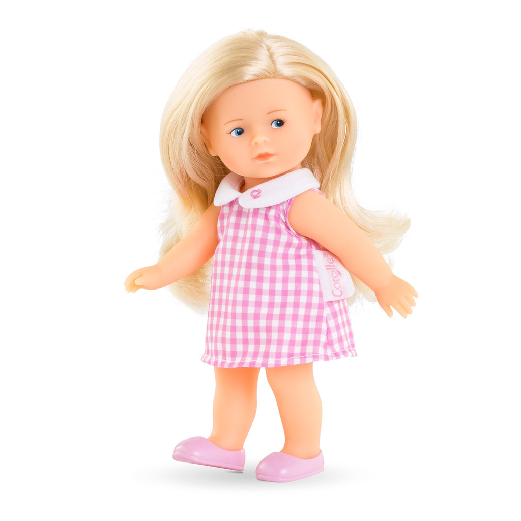 Mini Corolline Rosy is a petite doll ready to offer for any gift-giving occasion, with an all-vinyl body that is delicately scented with vanilla, a Corolle signature. Rosy has blue painted eyes and silky blonde hair. She's dressed in a pink-and-white gingham dress with a Peter Pan collar over underpants and matching molded shoes (not removable). At just 8 inches tall, Rosy is the ideal size to slip into a bag or backpack and accompany your child all day long.