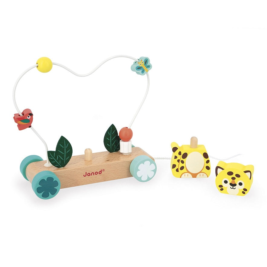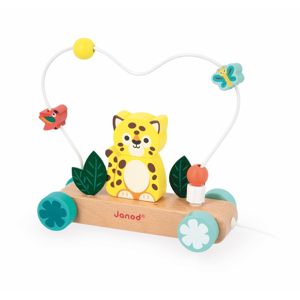 Little jaguar on a walk! With this wooden walking toy, baby can develop his motor skills from the age of 12 months. Ideal for accompanying first steps, our jaguar walker is easy to take everywhere thanks to its 50 cm string. It's full of discoveries for little ones! In fact, the jaguar comes in the form of a 2-part stacking toy, which fits onto the wooden stand decorated with felt leaves. But that's not all: a cool looping abacus with 5 wooden shapes to slide in and out, further stimulates baby's fine motor skills. Little butterflies and parrots love flying over our jaguar! This 2-in-1 learning toy accompanies baby's movements, while offering simple and varied manipulative activities.