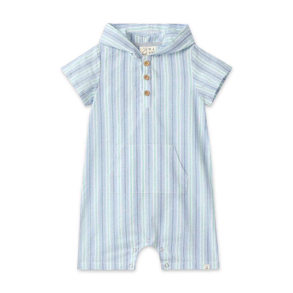 Me & Henry Baby Newlyn Hooded Woven Short Romper ~ Chambray/Blue Stripe