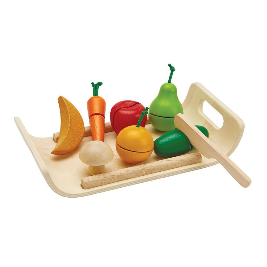 The Assorted Fruits & Vegetables set includes an apple, a pear, an orange, a banana, a cucumber, a mushroom, a carrot, a knife, and a tray.