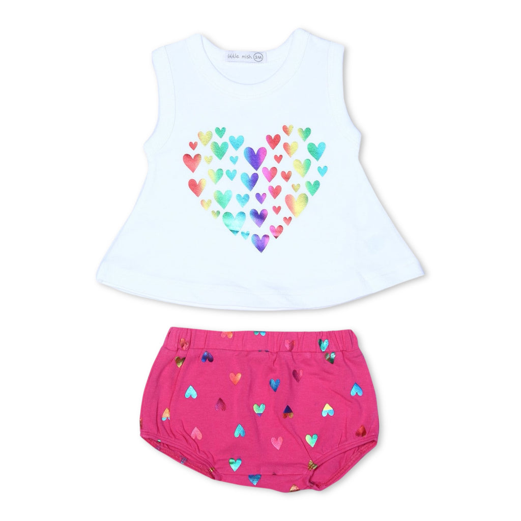 Little Mish Baby Rainbow Foil Heart Sleeveless Swing Top & Bloomer Set ~ White/Pink