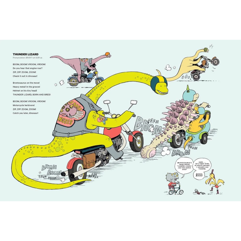 You’ve never seen a dinosaur that’s into driving cars? Well, buckle up! Brontosaurus, Triceratops, Pterodactyl and T. rex are all here to show off their driving, flying and diving skills in this riotous, fully illustrated book of poems about dinosaurs and their favorite things-that-go! From flighty Bambiraptor’s traffic chopper to hardheaded Pachycephalosaurus’s garbage truck to mama Maiasaura’s kid-carting minivan, and even to the stars beyond — these dinos on the go have no time to slow down. Each spread is full of fun details for young readers to pore over, but with our intrepid dino guides providing helpful dino facts on each page, you’ll never need a GPS again!