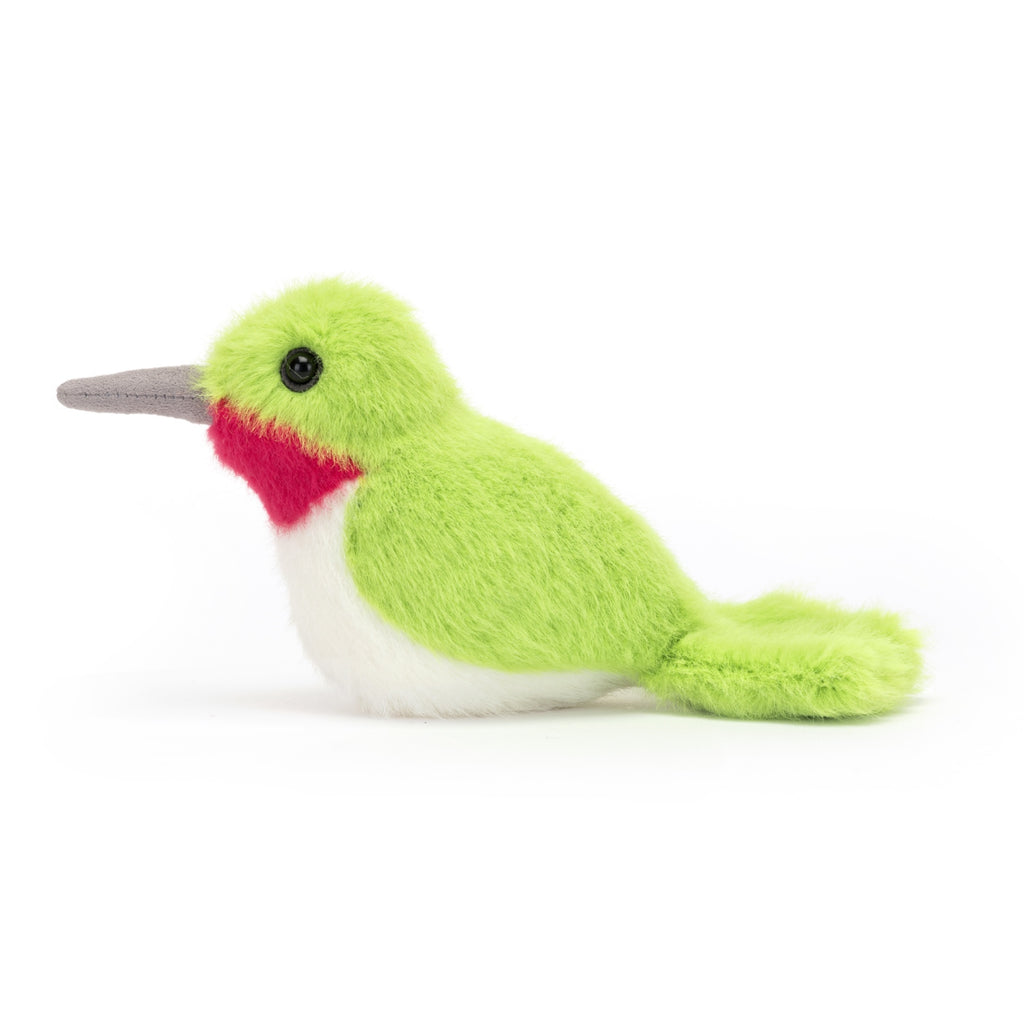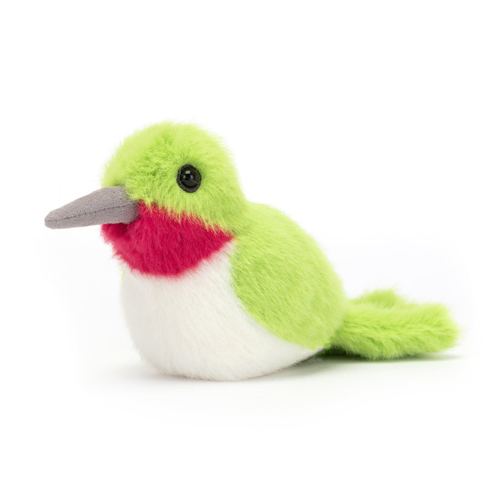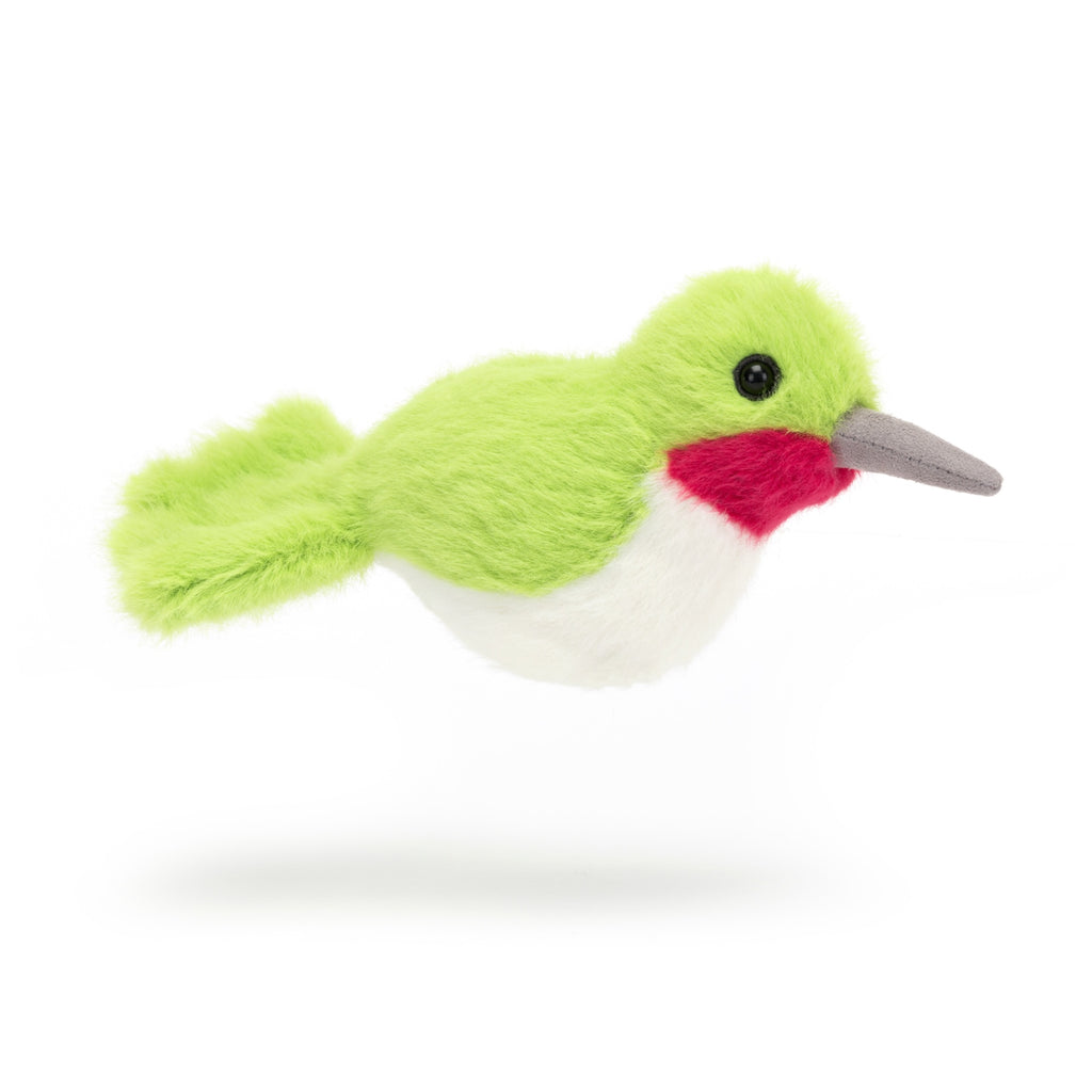 An exotic companion in a soft, halo-esque fur and warm weather highlights of zingy green and raspberry red Birdling Hummingbird is the perfect little gift to brighten up any shelf or desk.
