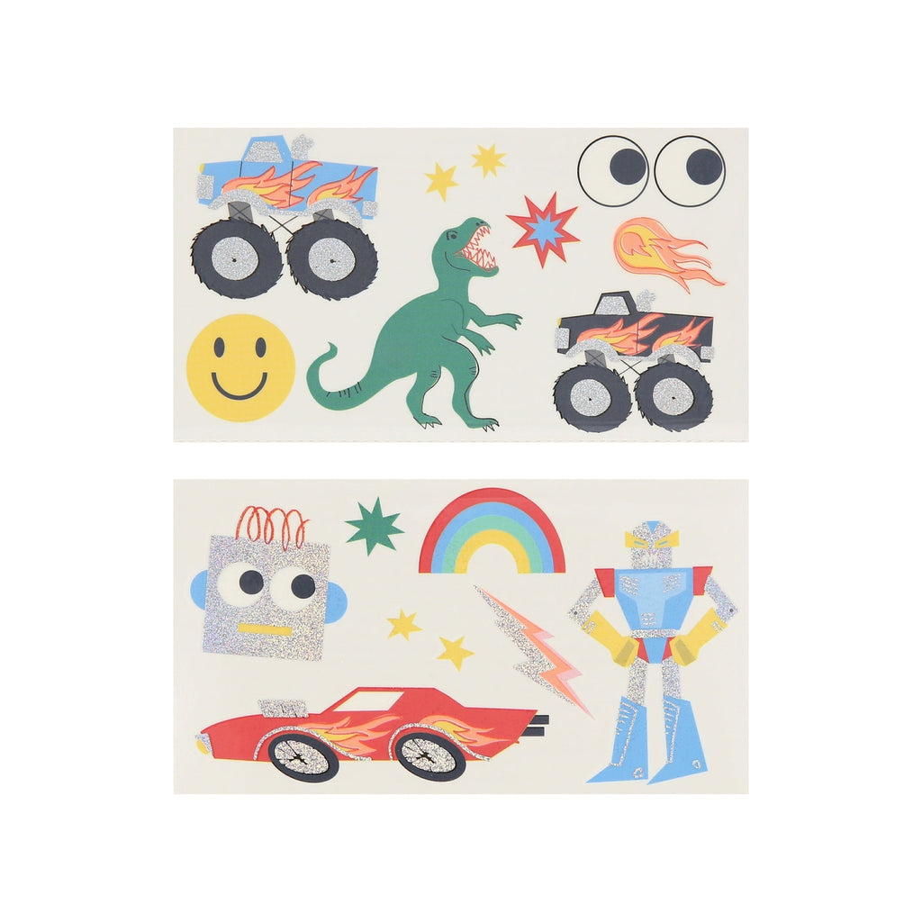 * Shiny silver holographic foil and pops of neon orange * The 2 sheets of tattoos are beautifully packaged in a paper envelope with shiny silver holographic foil details * Suitable for ages 3+ * Pack of 15 tattoos