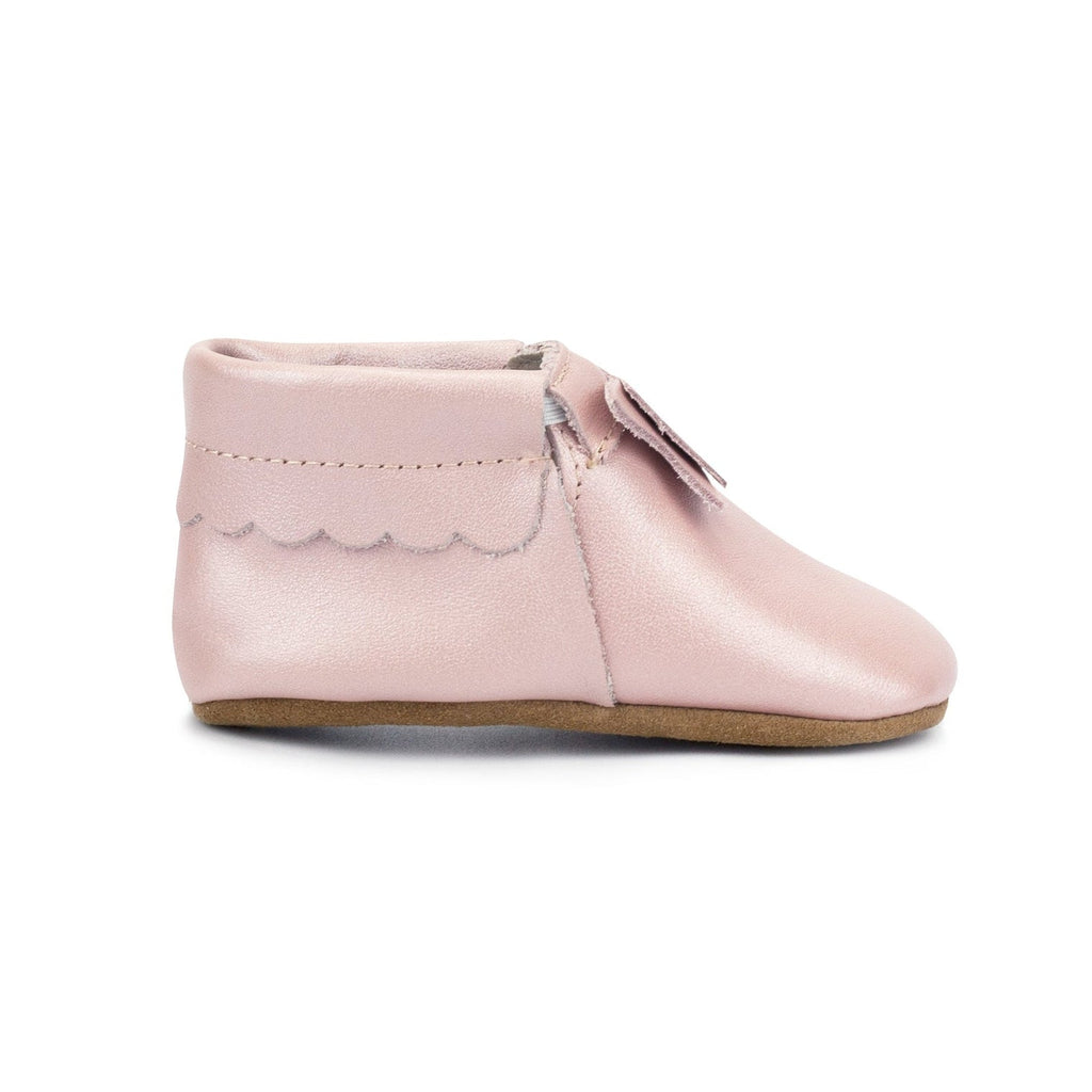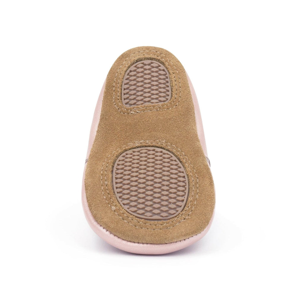 Our Bow Moccasins are a charming step forward in our leather baby shoe collection. Crafted from soft, genuine leather with a flexible sole, they’re designed to support new walkers while adding a sweet touch of shimmer. The cushioned insole keeps little feet comfy, the bow adds a dose of darling,...